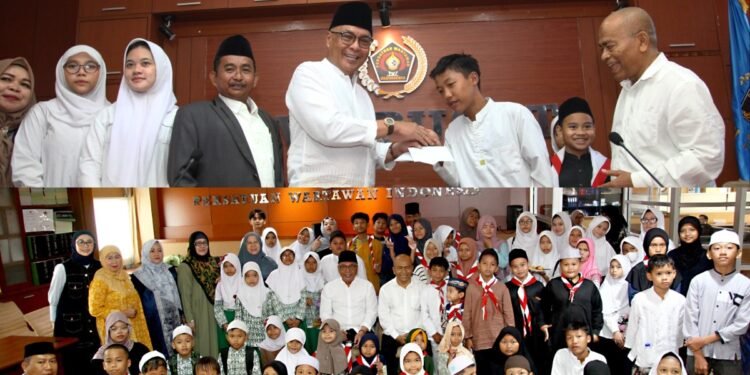 Gambar: Ketua Umum PWI Pusat, Akhmad Munir, didampingi Ketua Dewan Kehormatan, Atal S. Depari, secara simbolis memberikan santunan kepada anak yatim dari Yayasan Al-Hikmah dan Yayasan Harun Ar-Rasyid dalam acara tasyakuran kembalinya PWI ke kantor di Gedung Dewan Pers, Jakarta, Jumat (26/9/2025). Acara ini menandai era baru kepengurusan PWI periode 2025-2030 setelah satu tahun kantor tersebut tidak digunakan akibat dualisme.