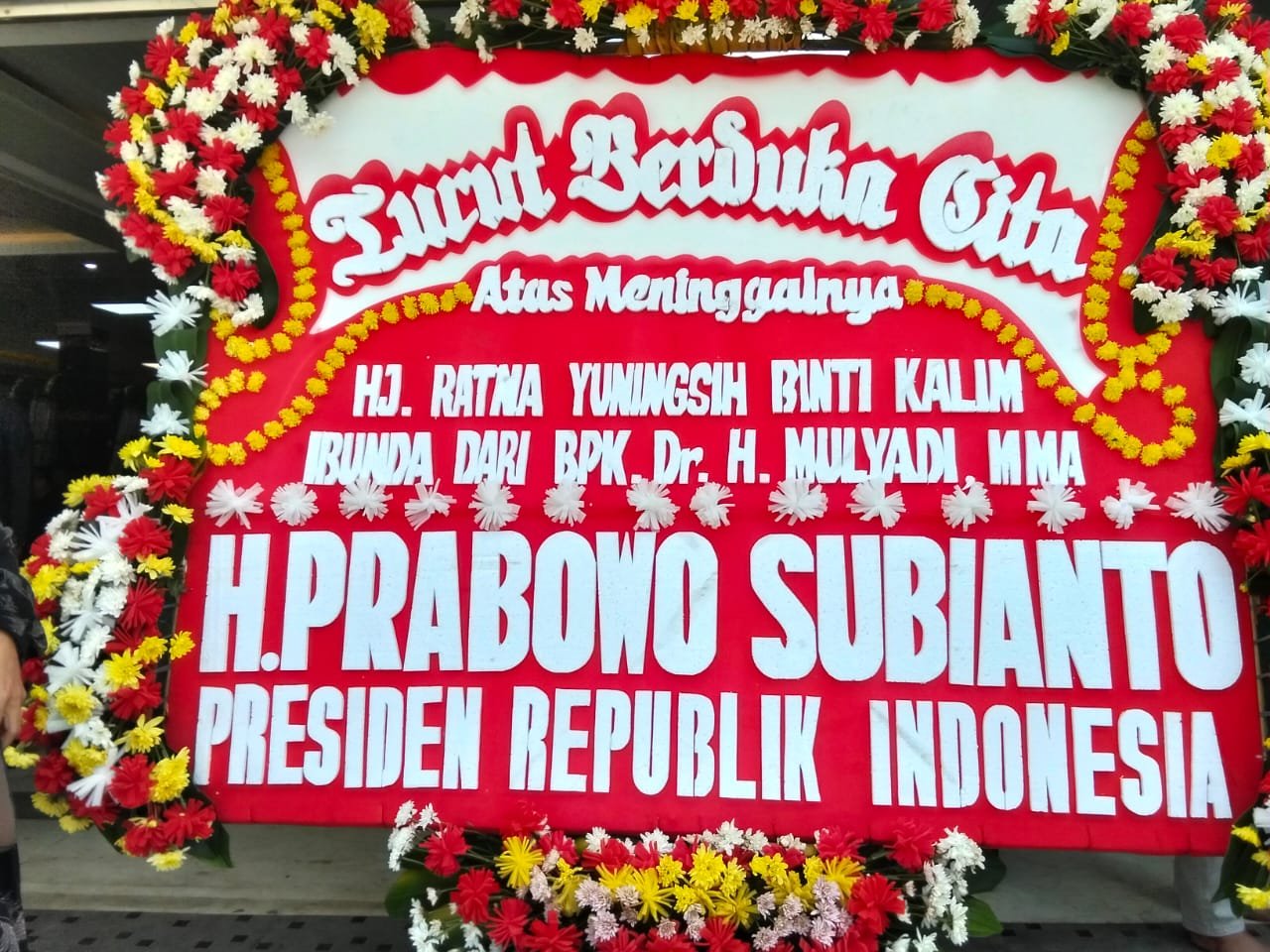 Gambar: Karangan bunga duka cita dari Presiden Republik Indonesia H. Prabowo Subianto untuk almarhumah Hj. Ratna Yuningsih binti Kalim, ibunda dari Anggota DPR RI Dr. H. Mulyadi, M.M.A.