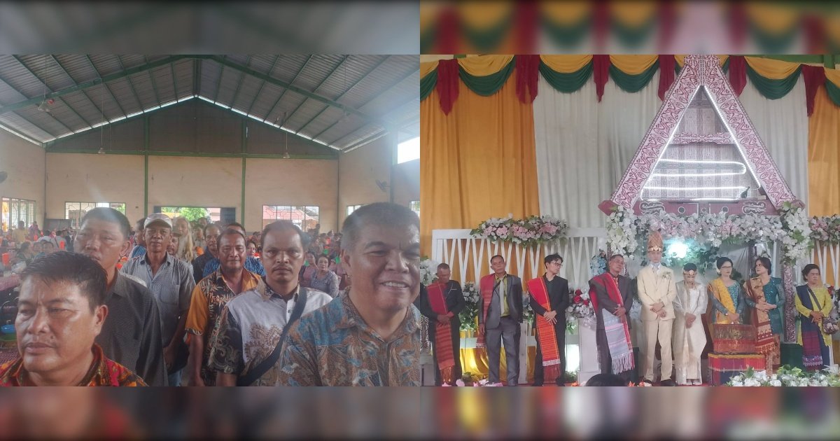 Gambar: Suasana akrab pernikahan adat Fernando Simamora dengan Sri Yanti Br. Sinaga di Sopo Godang Sidabutar, Pekanbaru. Tampak keluarga besar Judoka Kungfu Indonesia (JKI) Provinsi Riau hadir memenuhi gedung dalam foto kiri, sementara foto kanan memperlihatkan mempelai dan keluarga berjajar di atas panggung dengan dekorasi tradisional Batak yang megah, lengkap dengan kain ulos dan rangkaian bunga putih. Ketua JKI Riau Abadi Samosir bersama Guru Besar Kingron Sidabutar memimpin rombongan yang antusias merayakan momen bahagia ini sebagai wujud kebersamaan dalam komunitas bela diri.
