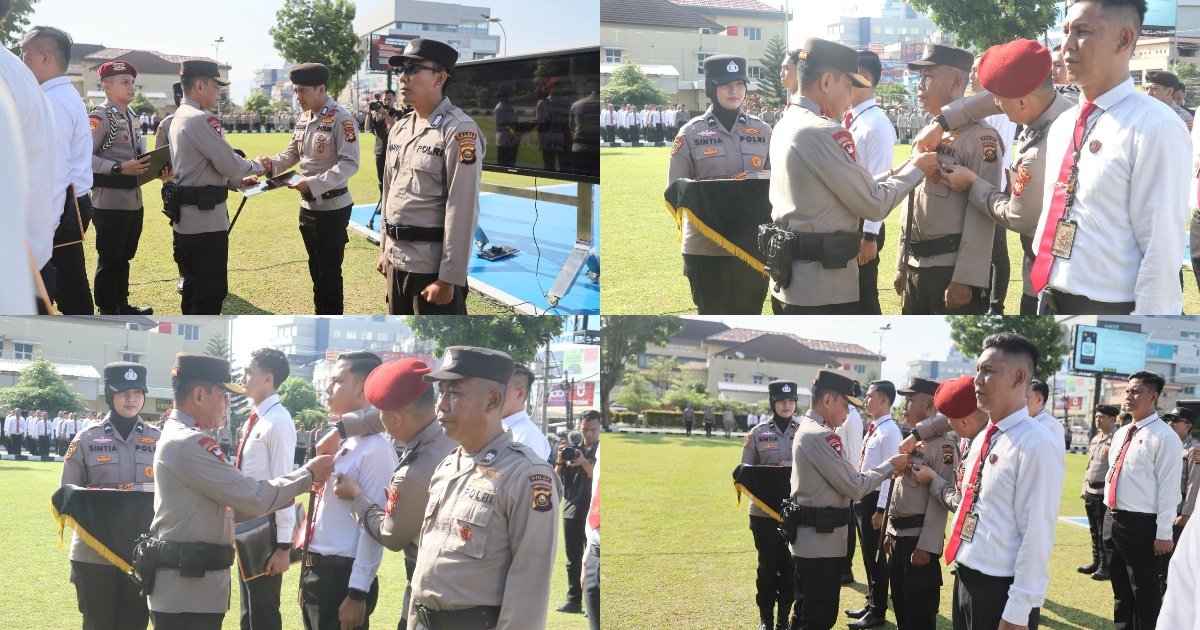 Gambar: Kapolda Sumatera Selatan, Irjen Pol Andi Rian R. Djajadi, menyematkan pin penghargaan dan menyerahkan piagam kepada personel berprestasi dalam upacara yang digelar di Lapangan Apel Mapolda Sumsel. Apresiasi ini diberikan atas berbagai keberhasilan, mulai dari pengungkapan kasus kriminal hingga prestasi di bidang olahraga dan kemanusiaan.