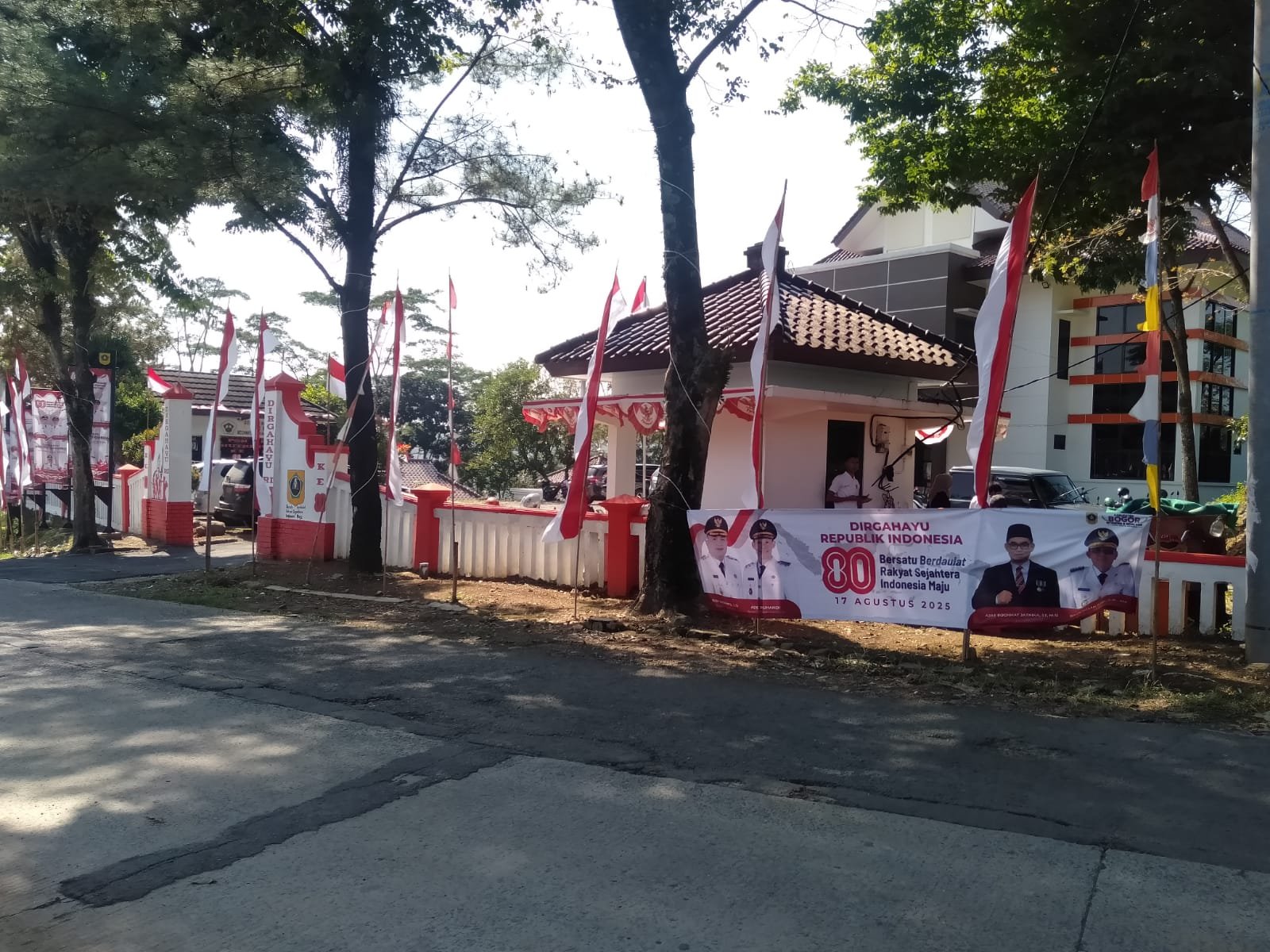 Gambar: Suasana halaman kantor pemerintahan di Kecamatan Sukamakmur, Kabupaten Bogor, yang dihiasi bendera dan umbul-umbul merah putih dalam rangka peringatan HUT ke-80 Kemerdekaan Republik Indonesia.