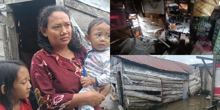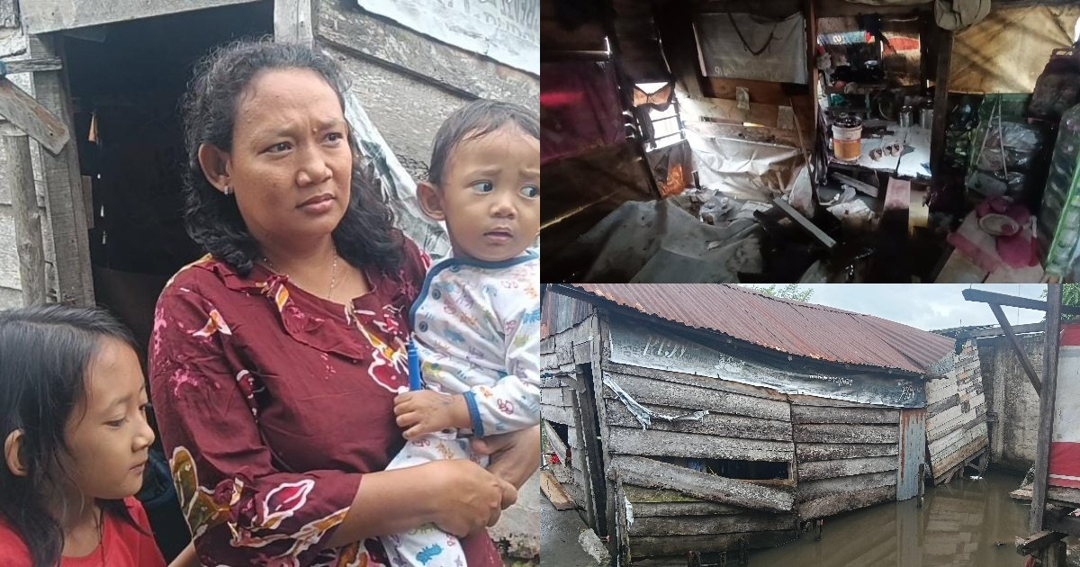 Gambar: Kolase foto memperlihatkan kondisi Elika Sari (kiri) bersama kedua anaknya dengan raut wajah sedih, serta kondisi rumah mereka di Kelurahan Karang Anyar, Palembang, yang rusak parah. Bagian kanan atas menunjukkan interior rumah yang berantakan dan sempit, sementara bagian kanan bawah memperlihatkan eksterior rumah panggung berdinding kayu yang miring dan nyaris roboh ke dalam genangan air pasang.