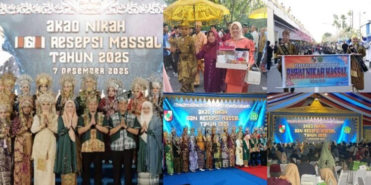 Gambar: Rangkaian foto menampilkan suasana prosesi dan puncak acara Akad Nikah dan Resepsi Massal Tahun 2025 di Pekanbaru, mulai dari arak-arakan pasangan pengantin dalam busana adat Melayu, pawai nikah massal di sekitar kawasan Jalan Jenderal Sudirman, hingga momen para pasangan bersanding di pelaminan besar dan berfoto bersama pimpinan daerah di panggung utama berlatar tulisan “Akad Nikah dan Resepsi Massal Tahun 2025” di halaman Mal Pelayanan Publik (MPP) Pekanbaru.