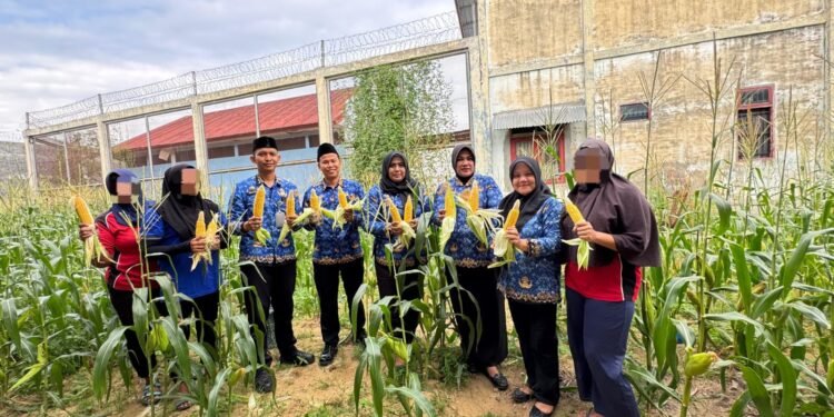 Gambar: Kepala Lapas Perempuan Kelas IIB Sigli, Yuliana, bersama jajaran dan warga binaan memamerkan hasil panen jagung manis di lahan pertanian lapas, Senin (10/11/2025). Kegiatan ini merupakan implementasi program pembinaan kemandirian bagi warga binaan yang bertujuan meningkatkan keterampilan sekaligus mendukung program ketahanan pangan nasional.