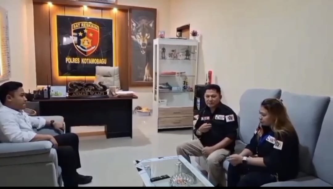 Gambar: Suasana pertemuan antara pihak DPC PROJAMIN Bolaang Mongondow saat berkoordinasi dengan Kasat Reskrim Polres Kotamobagu, AKP Akhmad Kaafi, S.Tr.K., di ruang kerjanya terkait penanganan kasus kekerasan terhadap anak yang melibatkan tersangka Andi Dako.