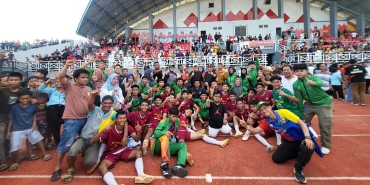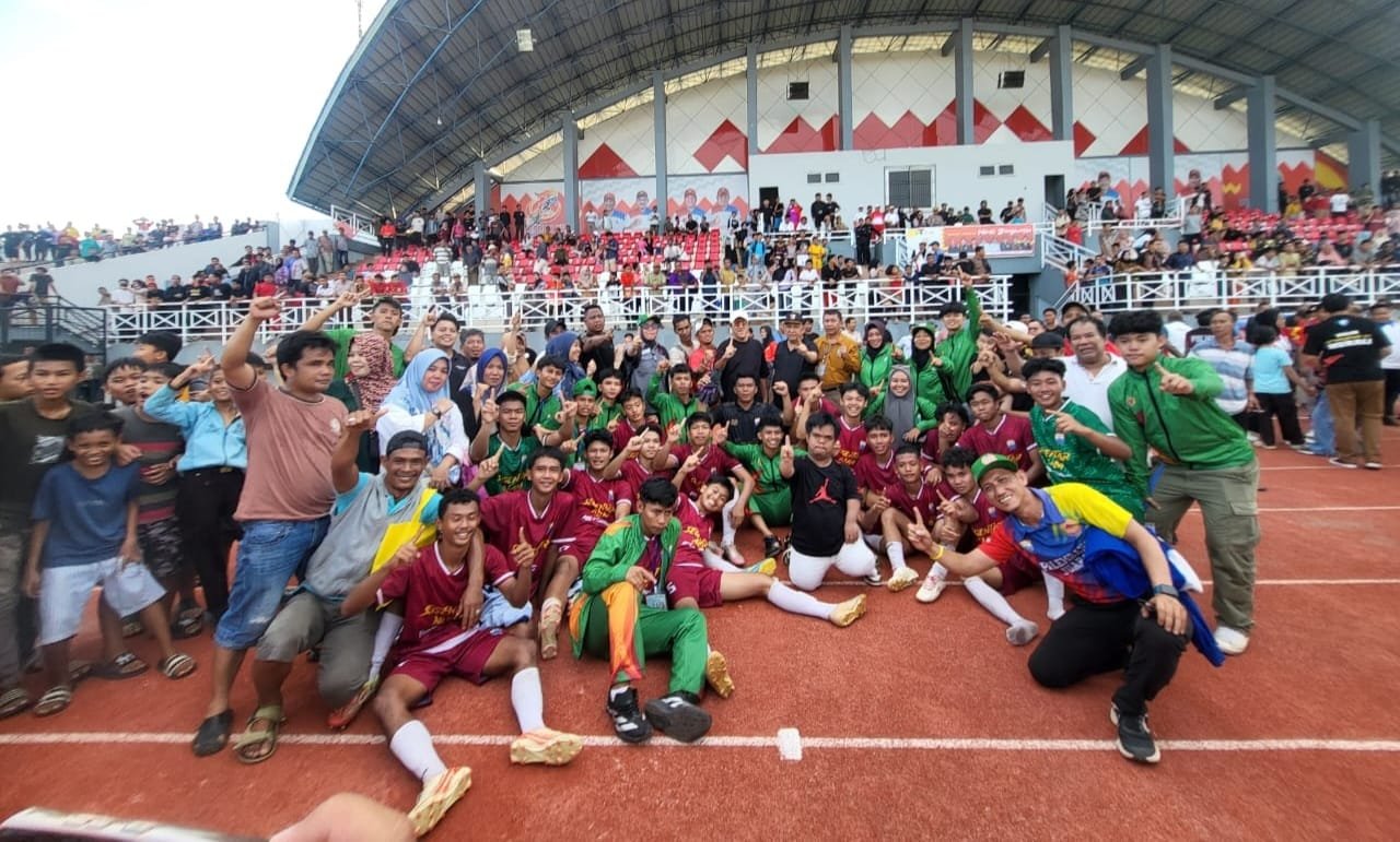 Gambar: Para pemain PS Palembang dan tim Lubuk Linggau berpose bersama di lapangan Stadion Serasan Sekate, Sekayu, Musi Banyuasin usai pertandingan final cabang olahraga sepak bola Porprov XV Sumatera Selatan 2025. Ratusan penonton memadati tribun stadion menyaksikan pertandingan seru yang berakhir dengan kemenangan PS Palembang 1-0 atas Lubuk Linggau, mengakhiri puasa gelar emas sepak bola Kota Palembang selama 23 tahun.