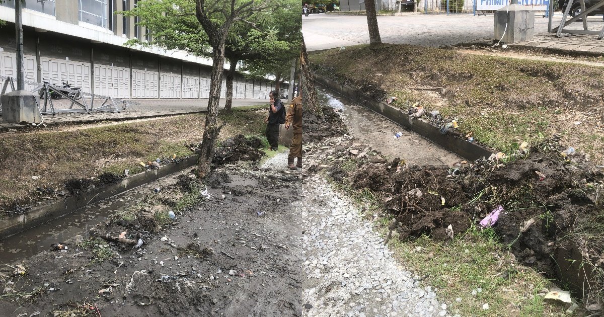 Gambar: Petugas berseragam bersama warga terlihat membersihkan dan mengeruk endapan lumpur serta sampah yang menumpuk di saluran drainase di tepi Jalan Uka, samping kawasan pertokoan yang tampak masih tutup, sebagai bagian dari upaya perbaikan jalan dan normalisasi drainase untuk mengurangi genangan air saat hujan.