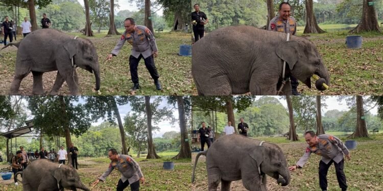 Gambar: Kapolda Riau Irjen Pol Herry Heryawan berinteraksi langsung dengan anak gajah bernama Dona di kawasan Taman Wisata Alam Buluh Cina, Kabupaten Kampar, Kamis 6 November 2025, sambil memberi pakan tebu segar dalam kegiatan patroli hutan dan penguatan sinergi konservasi satwa dilindungi.
