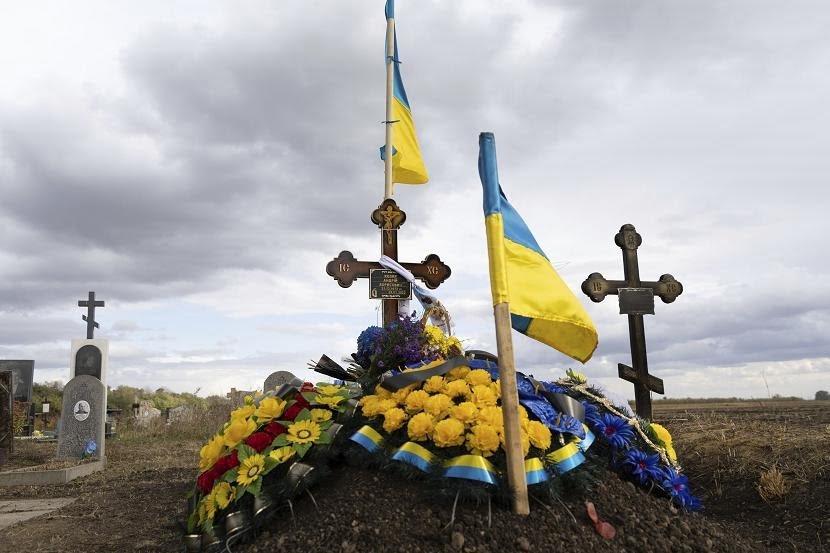 Di pemakaman tersebut, ada satu kuburan yang menonjol. Tanah yang baru saja digali ditumpuk di bawah karangan bunga berwarna biru dan kuning cerah yang senada dengan warna bendera Ukraina yang berkibar di atasnya tertiup angin.