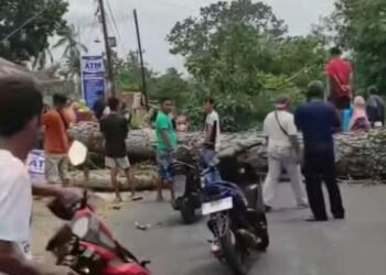 Read moreDetailsGambar: Sejumlah warga berkumpul di sekitar pohon besar yang tumbang dan melintang di tengah jalan akibat cuaca buruk, menghambat akses ...