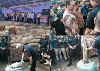 Gambar: Kolase foto memperlihatkan suasana pemusnahan barang ilegal yang dilakukan oleh Kanwil Bea Cukai Sumbagtim, mencakup jajaran pejabat yang berbaris ...