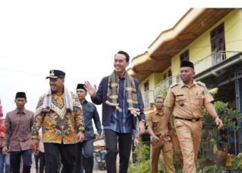 Gambar: Bupati Ogan Komering Ilir, H. Muchendi Mahzareki, dengan ekspresi sumringah berjalan beriringan bersama Camat, Kepala Desa, serta jajaran tokoh ...