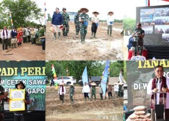 Gambar: Kolase foto kegiatan tanam padi serentak yang dipimpin oleh Komandan Korem 044/Garuda Dempo, Brigjen TNI Adri Koesdyanto, bersama Staf ...