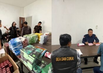 Gambar: Petugas Bea Cukai Dumai saat melakukan proses pelimpahan tersangka berinisial ES beserta barang bukti ratusan ribu batang rokok ilegal ...