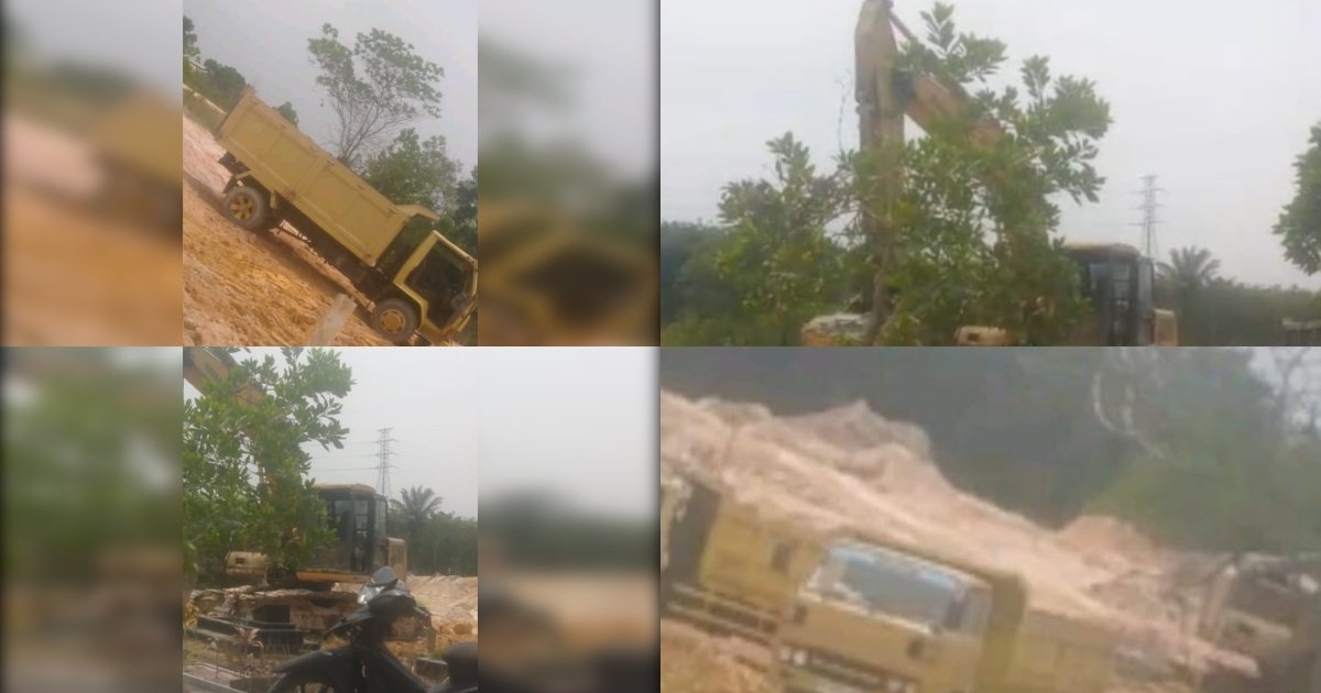 Gambar: Kolase foto yang menampilkan aktivitas penambangan galian C di Desa Baru, Kecamatan Siak Hulu, Kabupaten Kampar. Terlihat alat berat jenis ekskavator sedang beroperasi dan sebuah truk jungkit (dump truck) siaga untuk mengangkut material tanah timbun dari lokasi tambang yang diduga ilegal tersebut.