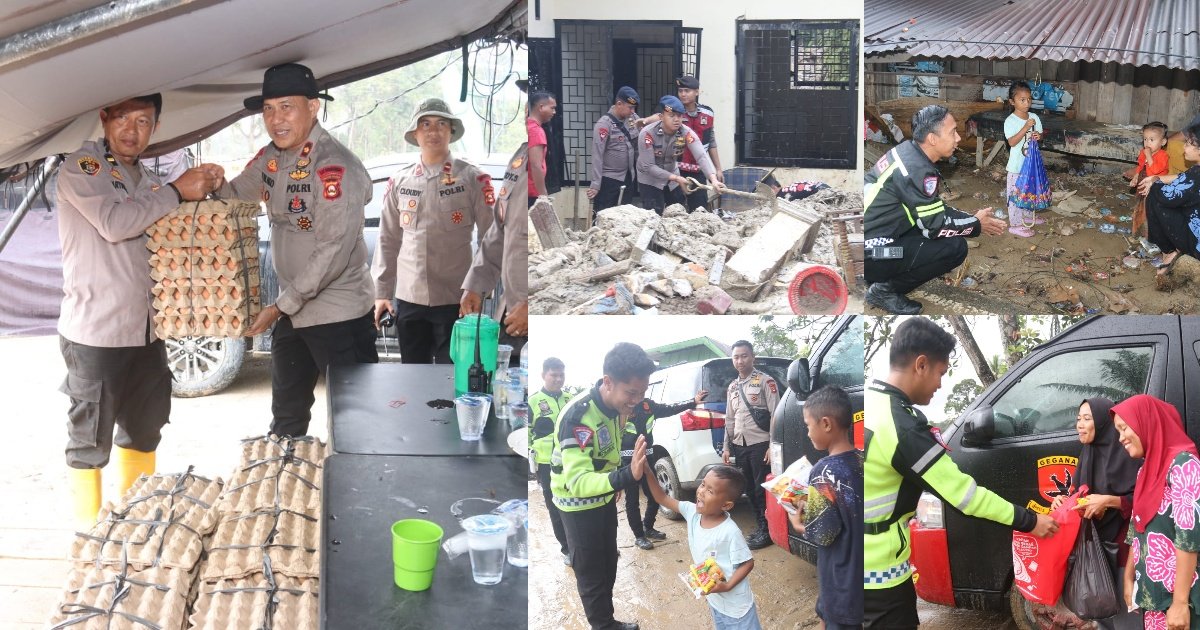 Gambar: Personel Satgas Pamwal Logistik Polda Sumsel menyalurkan bantuan kemanusiaan bagi warga terdampak bencana di Tapanuli Selatan, mulai dari pengawalan distribusi telur dan mi instan, membantu membersihkan rumah-rumah yang tertutup material banjir, hingga berinteraksi langsung dengan anak-anak dan keluarga korban untuk memastikan bantuan logistik dan dukungan psikososial tersampaikan dengan aman serta tepat sasaran di lokasi terdampak.