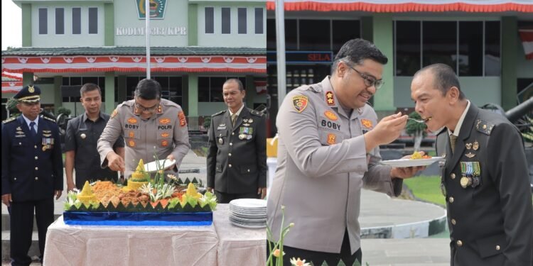 Gambar: Kapolres Kampar AKBP Boby Putra Ramadhan S. memberikan potongan tumpeng kepada Kasdim 0313/KPR Mayor Inf Hendri Donan sebagai kejutan pada perayaan HUT ke-80 TNI di Makodim 0313/KPR. Momen ini menunjukkan keakraban dan sinergitas antara institusi TNI dan Polri di Kabupaten Kampar.