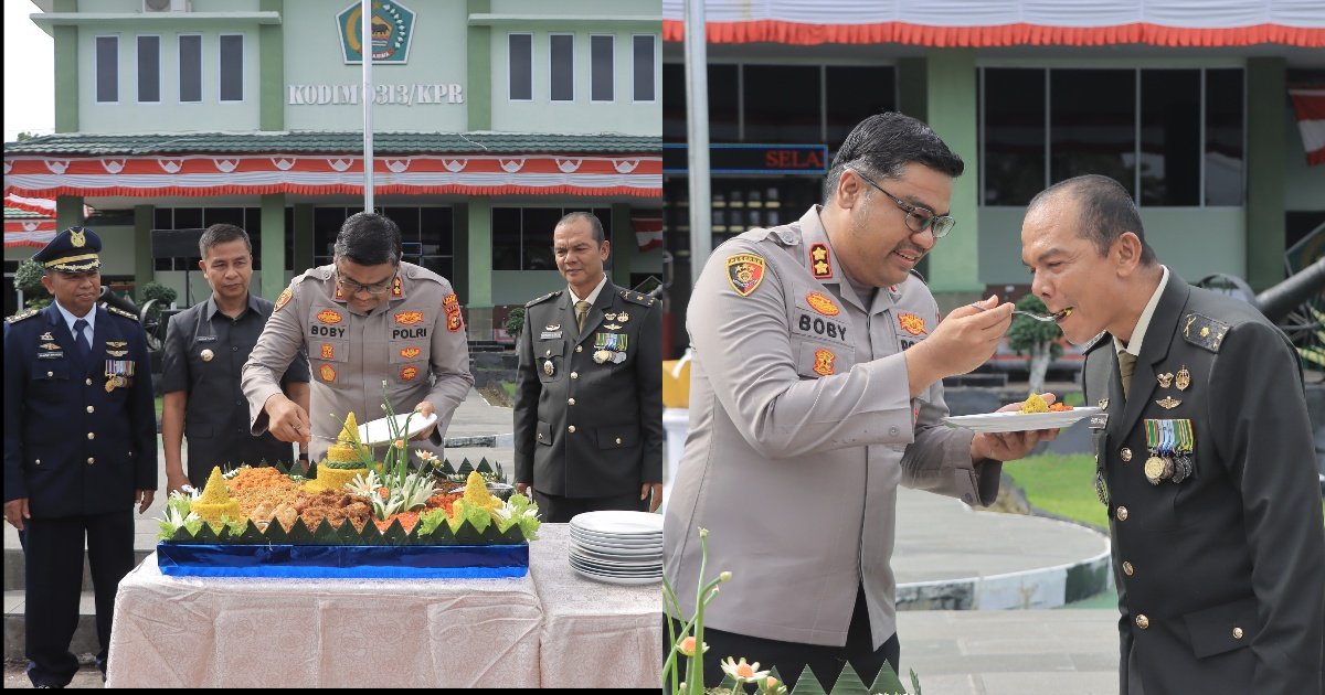 Dipimpin langsung oleh Kapolres Kampar AKBP Boby Putra Ramadhan S., rombongan PJU Polres Kampar memberikan ucapan selamat HUT TNI ke-80 dengan menyerahkan tumpeng kepada Dandim 0313/KPR. Kejutan ini diberikan usai upacara peringatan HUT TNI ke-80 yang digelar di Lapangan Makodim Kampar.